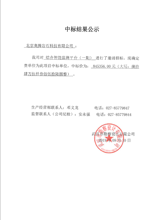 武漢市勘察設(shè)計(jì)有限公司綜合智能監(jiān)測(cè)平臺(tái)(一期)中標(biāo)結(jié)果公示