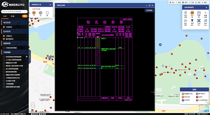 平臺(tái)基于標(biāo)準(zhǔn)化的工作流程,采用多重校審及分級(jí)管控的手段,通過配置,完成了從數(shù)據(jù)歸檔入庫(kù)到在線借閱的全過程服務(wù)與管理,滿足生產(chǎn)效率的同時(shí)保證了數(shù)據(jù)的準(zhǔn)確性及安全性。平臺(tái)支持鉆孔地層的標(biāo)準(zhǔn)化,完成了歷史存量數(shù)據(jù)的坐標(biāo)轉(zhuǎn)換,解決了因地層代號(hào)和坐標(biāo)系不統(tǒng)一而無(wú)法共享的問題。平臺(tái)實(shí)現(xiàn)了在網(wǎng)頁(yè)端基于CAD繪制勘察圖件的功能,支持柱狀圖、剖面圖、等值線圖的自動(dòng)生成?捎嗅槍(duì)性的對(duì)研究區(qū)域鉆孔篩選過濾,使統(tǒng)計(jì)分析結(jié)果可靠度更高。平臺(tái)具有較完善的數(shù)據(jù)接口,實(shí)現(xiàn)了與公司自主研發(fā)的勘察資料處理軟件的無(wú)縫對(duì)接,兼容各種地質(zhì)專題GIS數(shù)據(jù)。不僅可直接入庫(kù)勘察軟件數(shù)據(jù),還能以項(xiàng)目和鉆孔的維度輸出涵蓋地層及試驗(yàn)信息的可在勘察軟件中直接利用的文件。